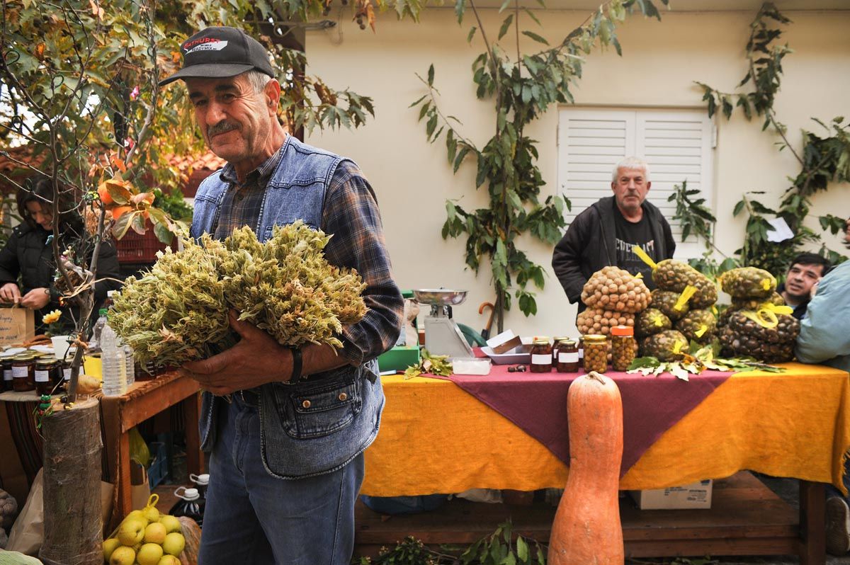 Πολλοί νέοι καλλιεργητές στήνουν πάγκους με πολυτάρια (μεγάλες κοφίνες) και σακιά γεμάτα με ρόδια, λωτούς, κάστανα, φιρίκια, μέλια, καρύδια, μήλα, κολοκύθες και αμύγδαλα. «Καλλιεργημένα μόνο με κοπριά και πολύ ήλιο», δηλώνουν. Γλυκά του κουταλιού και μαρμελάδες νεράντζι, περγαμόντο, φυρίκι, συκαλάκι, αχλάδι. Νέκταρ το γλυκό κάστανο. Χυλοπίτες και τραχανάς τριμμένος στο κόσκινο. Κολατσιό με λαλάκια ή λαλαγκίδες, ντόπιο κεφαλοτύρι ή σφέλα βαρελίσια, σύγκλινο, ελιές και λούπινα. Από τον παραγωγό κατευθείαν στον καταναλωτή! Μποτίλιες με σπιτικό κρασί, άγρια αρωματικά βοτάνια του Ταϋγέτου, ρίγανη, τσάι, θυμάρι, φασκόμηλο και μέντα μαζεμένα με το χέρι. Δεν λείπει βέβαια το αρχοντογλύκισμα του τόπου: χειροποίητες δίπλες, πασπαλισμένες με φρεσκοτριμμένα καρύδια και το θυμαρίσιο μέλι να ρέει πάνω τους.