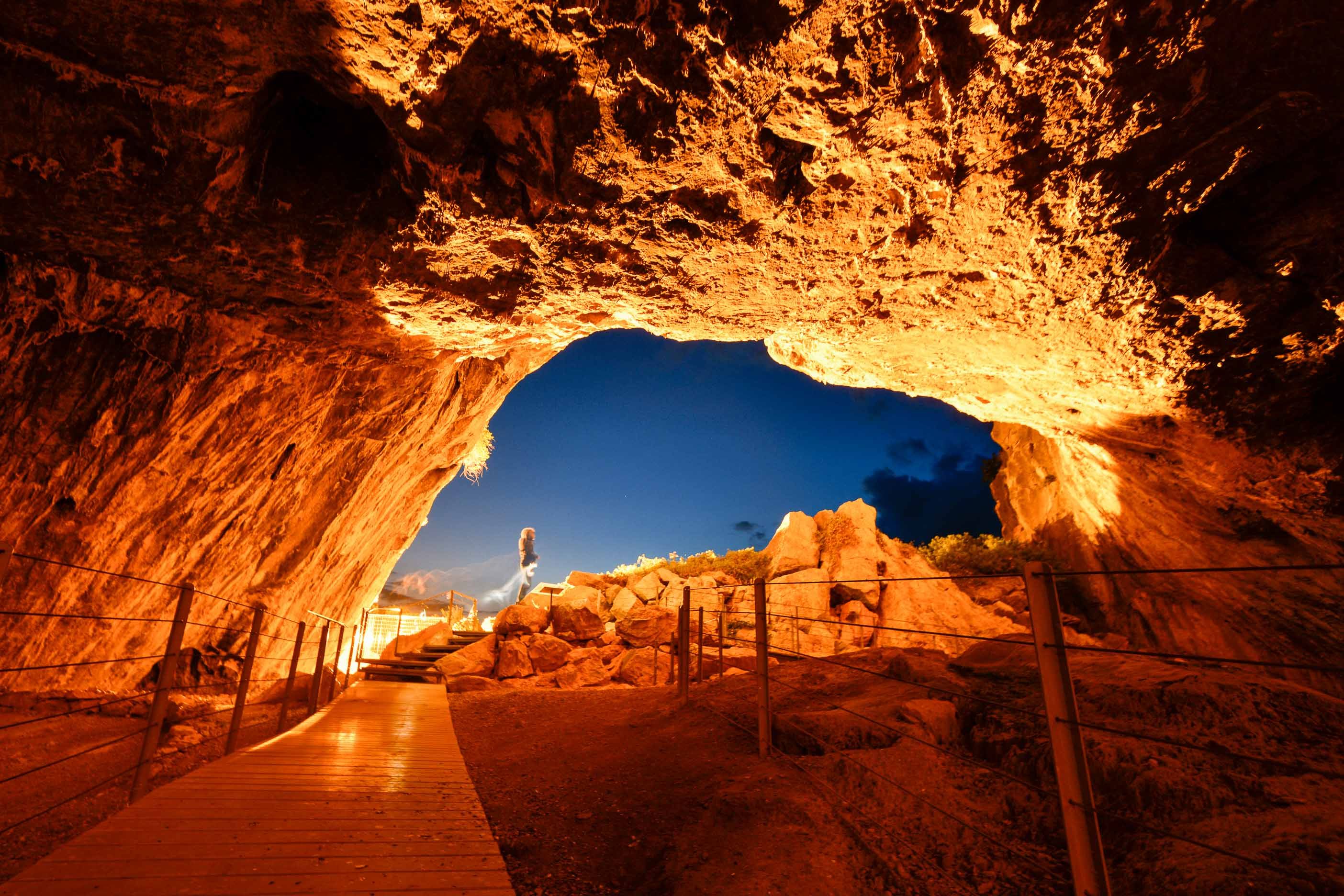 Θα επιστρέψω το σούρουπο από άλλο δρόμο για να δω το σπήλαιο φωτισμένο τεχνητά. Αξίζει τον κόπο, ο προσανατολισμός του είναι δυτικός και είναι ευκαιρία για να απολαύσεις τα χρώματα της δύσης. Η αφετηρία μου αυτή τη φορά ήταν η παραλία Λαμπάγιαννα από την αντίθετη μεριά. Η απόσταση του μονοπατιού ήταν περίπου η ίδια, όμως η δυσκολία πολύ μικρότερη, κάτι που καθιστά την επιστροφή με τον φακό πολύ πιο εύκολη. Η αίσθηση μέσα στο σπήλαιο με τον τεχνητό φωτισμό και τις κυανές ανταύγειες του λυκόφωτος είναι απόκοσμη. Συντροφιά σου τα πουλιά που ζουν στο σπήλαιο, πετούν μπαινοβγαίνοντας συνεχώς. Το έντονο πορτοκαλί του φωτισμού με το βαθύ μπλε της ημέρας που σβήνει και δίνει τη σκυτάλη στη νύχτα, αυτόματα σε μεταφέρει στο παρελθόν την ώρα που οι άνθρωποι των σπηλαίων θα άναβαν τις φωτιές για να μαγειρέψουν, να ζεσταθούν και να ξεκουραστούν γελώντας και λέγοντας ιστορίες απολαμβάνοντας το τέλος μιας ακόμη μέρας που τους βρήκε πάλι ζωντανούς.