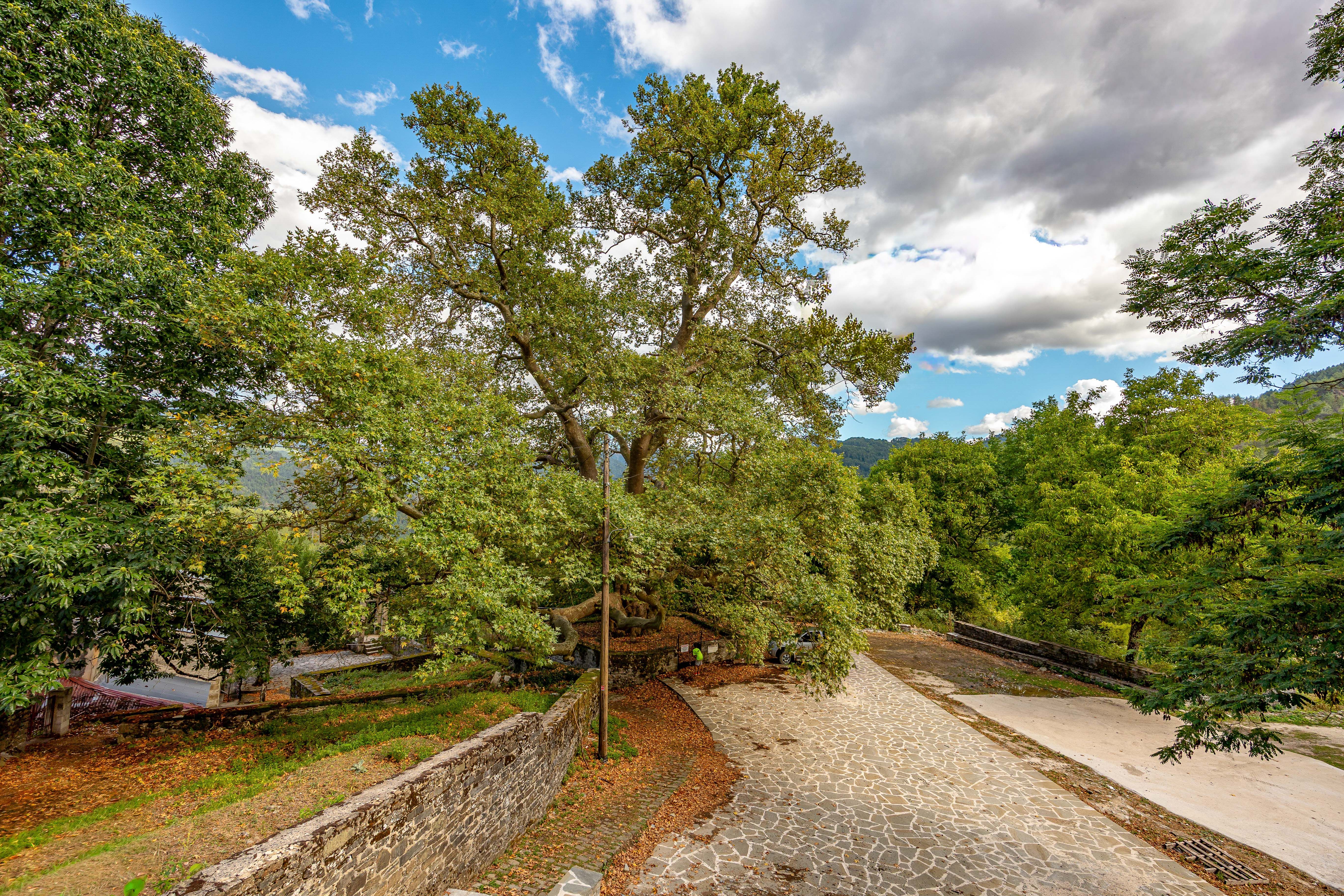 της αυλή δεσπόζει ο αιωνόβιος πλάτανος, με περίμετρο 10,5