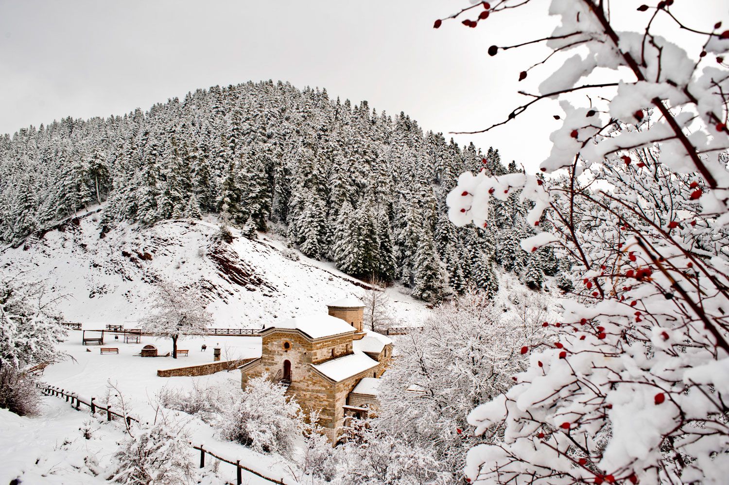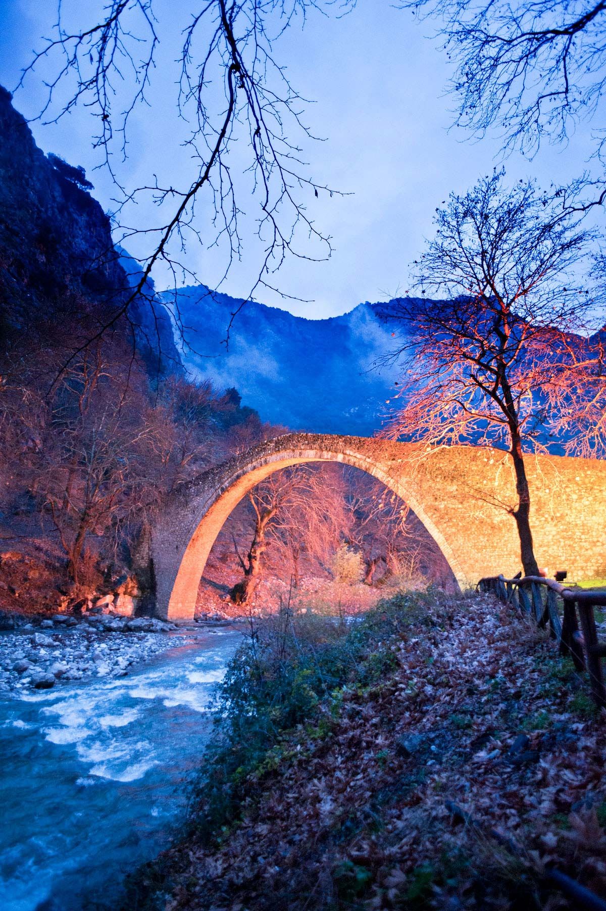Στο µοναστήρι της Κοιµήσεως Θεοτόκου Γκούρας µε την πανοραµική θέα προς τον Θεσσαλικό κάµπο, οι µοναχές µε κερνάνε λουκουµάκι στο αρχονταρίκι και προσευχές ευγνωµοσύνης. Στιγµή χαράς που ούτε καν την είχα παραγγείλει, αισθάνοµαι διαβαίνοντας τον φουσκωµένο Πορταϊκό ποταµό από τη µεγαλύτερη κρεµαστή πεζογέφυρα των Βαλκανίων. Βγαίνοντας από την Πύλη πέφτω στην αγκαλιά των πανύψηλων πλατανιών και των τρεχούµενων νερών στο ειδυλλιακό σκηνικό του νερόµυλου και της νεροτριβής, της «ντριστένιας», όπως τη λένε οι ντόπιοι. Στο Καφέ «Νερόµυλος», πλάι στα αναµµένα ξύλα του τζακιού απολαµβάνω µια κούπα ζεστό φασκόµηλο µε µέλι (τον χειµώνα ανοίγει µόνο Παρασκευοσαββατοκύριακα).