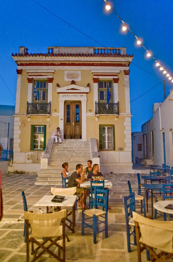 Άγρια, µε στενά σοκάκια η Χώρα είναι µια ακόµη καλλονή του Αιγαίου. Ανεβαίνω µε το λεωφορείο, κατεβαίνω τα λιθόχτιστα πλατύσκαλα ως το Λιβάδι για να χαρώ τη θέα − Σίφνο και Μήλο − ανάµεσα στα αγριολούλουδα, τους µπαξέδες και τα ασβεστωµένα σπιτικά. ∆υο λεωφορεία τα καλοκαίρια πηγαινοέρχονται. Ακολουθώ το ένστικτό µου ανεβαίνοντας στο φιδίσιο σοκάκι προς το Κάστρο. Απόκοσµη θέα από τις αυλές εκκλησιών µέχρι την ψηλότερη του Αγίου Κωνσταντίνου. Η µατιά µετά την ερωτική καµπυλότητα του τρούλου, αφήνεται στη θέα του λιµανιού µε τα στολισµένα µε λαµπιόνια καράβια που φεύγουν στα ανοιχτά... Κι η νύχτα φεύγει στα καταστήµατα, τα καφέ και τα µαγειρεία που είναι µαζεµένα στην πλατεία του νεοκλασικού κτιρίου του δηµαρχείου ή πλατεία του Άη-Θανάση.