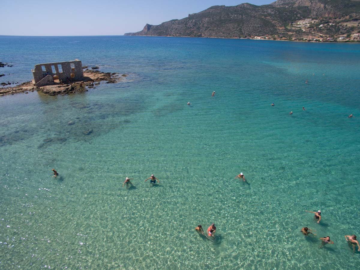 Την εποµένη ταξιδεύω προς το νοτιότερο µέρος της Λακωνικής χερσονήσου, τα Βάτικα. Πρώτη µου στάση η παραλία της Πούντας, γνωστή για το λιµανάκι που οδηγεί στην εξωτική Ελαφόνησο. Το καραβάκι πηγαίνει κι έρχεται κουβαλώντας αυτοκίνητα, προϊόντα και κυρίως την επιθυµία των επιβατών για αξέχαστες διακοπές. Τα γαλαζοπράσινα νερά και οι αµµοθίνες, οι χαρακτηριστικοί αµµόλοφοι, θυµίζουν Καραϊβική. Σε µια γραµµή 5 χιλιοµέτρων και σε συνέχεια της Πούντας βρίσκονται οι παραλίες του Μάγγανου και του Νερατζιώνα, αποτελώντας ουσιαστικά µια πελώρια χρυσαφένια ακτογραµµή. Όποιος επιθυµεί απεριόριστο παιχνίδι στην άµµο, εδώ είναι ο ιδανικός προορισµός. Καθώς οι πατούσες µου χώνονται στην καυτή άµµο, περπατώντας πάνω σε βότσαλα και κοχύλια, πέφτω πάνω στα αρχαία λείψανα του σπουδαιότερου λιµανιού σε όλη την νότια Ελλάδα. Είναι το Παυλοπέτρι µε την αρχαιότερη βυθισµένη πολιτεία στον κόσµο. Θολωτοί τάφοι, φαγωµένα πιθάρια, αυλές σπιτιών και προϊστορικοί δρόµοι ξεκινούν από την παραλία και χάνονται κάτω από το κύµα σε βάθος µόλις 3 µέτρων µέχρι και την απέναντι οµώνυµη βραχονησίδα. Είναι απίστευτο πως ο πρώτος άνθρωπος κατοίκησε αυτόν τον τόπο πριν 5.500 χρόνια. Λάδι, κρασί, εργαλεία από ηφαιστειακό γυαλί, πολύτιµα κοσµήµατα και χιλιάδες άλλα εµπορεύµατα περνούσαν από εδώ, µέχρις ότου η πολιτεία που άκµαζε οικονοµικά να καταποντιστεί µια για πάντα, ύστερα από έναν µεγάλο σεισµό, τον ίδιο που βύθισε και τον αρχαίο Ασωπό. Ακριβώς πίσω από τους αµµόλοφους της παραλίας και τα αρχαία λείψανα πολιτισµού, κρύβεται ένας βιότοπος, πραγµατικό θησαυροφυλάκιο, η λιµνοθάλασσα Στρογγύλη. Η περιοχή αποτελεί σταθµό για τις µεταναστεύσεις των πουλιών από και προς την Αφρική και κατοικία σπάνιας χλωρίδας, όπως ένα απειλούµενο είδος κέδρου, τον θαλασσόκεδρο. Το καλοκαίρι πέφτει η στάθµη κι έτσι τώρα έχω τη δυνατότητα να περπατώ σε σηµεία που το χειµώνα πληµµυρίζουν µε υφάλµυρο νερό. Τιτιβίσµατα ακούγονται µπροστά µου. Τρεις καλαµοκανάδες, ένα από τα 132 είδη πτηνών που βρίσκουν καταφύγιο εδώ, ψάχνουν για την τροφή τους, τριγυρίζοντας µε τα λεπτά τους πόδια και το µακρύ ράµφος τους. Νιώθω ότι τα ενοχλώ και αποµακρύνοµαι. Πέφτω πάνω σε έναν περίεργο λευκό αφρό που µαζεύεται συνεχώς στις όχθες της λιµνοθάλασσας. Προς στιγµήν, νοµίζω πως ο άνθρωπος έβαλε πάλι το χεράκι του και µολύνει την σπάνιας οµορφιάς περιοχή. Ευτυχώς, είναι το αποτέλεσµα της αποσύνθεσης του ζωοπλαγκτόν και του φυτοπλαγκτόν, που βρίθουν στο ιδιαίτερο αυτό οικοσύστηµα.