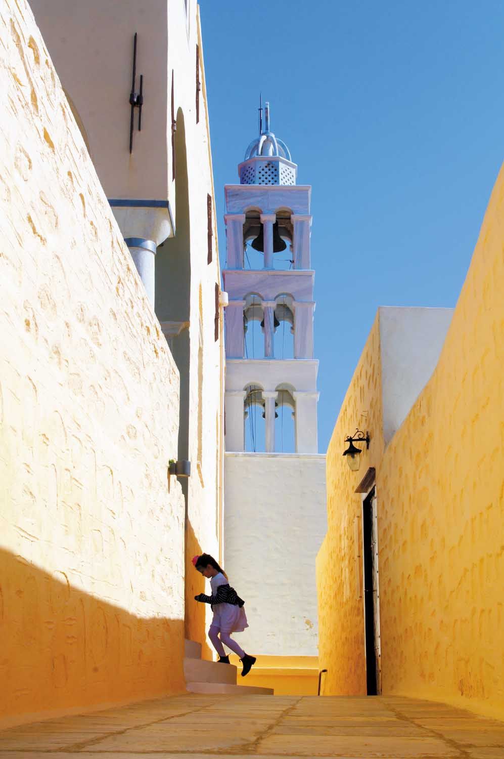 Μέσα απ’ την καμάρα που σχηματίζει το σχοινάκι στα κοριτσίστικα πηδηματάκια, διακρίνω μια άλλη καμάρα, που με προσκαλεί να ανακαλύψω και τον δικό της κόσμο, τον λόφο των καθολικών, την Άνω Σύρο. Τοίχο τοίχο σε μια παλ μουσικότητα, τα ζαχαρένια σπιτάκια με οδηγούν στο Μουσείο του Μάρκου Βαμβακάρη. Σιμά η πλατεία του, υπερήφανη για μια θέα ασύγκριτη, την οποία τώρα απολαμβάνουν και οι προσφιλείς σε μένα γατούλες, που κρατούν συντροφιά στην προτομή του μεγάλου ρεμπέτη. Εξάλλου, η Σύρος αγαπάει τα γατρόνια. Έχει μεριμνήσει να έχουν πάντα λίγο φαγητό και νεράκι στα ειδικά διαμορφωμένα παρκάκια που έχουν φτιαχτεί γι’ αυτά.Κυριακή των Βαΐων και κατευθύνομαι στην καθολική τρίκλιτη Βασιλική της μίας κορφής, τον Άγιο Γεώργιο (Σαν Τζώρτζη). Ο τριγμός της καμπάνας τόσο αργός όσο το σούρσιμο της μαγκούρας ενός παππού, που φτάνει στον ναό για μια ακόμα προσευχή. Το αεράκι που στριμώχνεται στους υποκίτρινους τοίχους των σοκακιών, πεντάγραμμο που συγκρατεί τον ψαλμό των καθολικών πιστών σε μια πομπή που όλο πλησιάζει. Ανεμίζει ο άλικος χιτώνας του ιερέα, καθώς περνά από μπροστά μου, και με τα μάτια χαμηλά αφήνω πάνω του να πέσουν δυο τρεις γλυκές μου αμαρτίες, να συγχωρεθούν.
