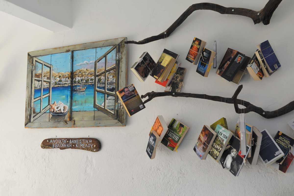 Πολύ κοντά και η αγορά µε τα µπαράκια και την ταβέρνα της. Ένα είδος κέντρου του χωριού για την όποια βραδινή ζωή µπορεί να έχει το µικρό αυτό νησάκι, που όλοι θα το προτιµήσουν για το ακριβώς αντίθετο: Τις ήσυχες διακοπές που µπορεί να σου προσφέρει. Όπως βλέπεις το Χωριό από µακριά, ξεχωρίζει η εκκλησία της Παναγιάς της Οδηγήτριας, που είναι και η µεγαλύτερη του νησιού, η οποία επίσης βρίσκεται πολύ κοντά στο κάστρο. Λίγο πιο κάτω, όµως, σε κερδίζει το πανέµορφο πέτρινο εκκλησάκι του Αϊ-Γιάννη του Χρυσοστόµου. Το Χωριό αλλά και όλο το νησί είναι γεµάτο γραφικά ξωκλήσια, όπως όλα τα κυκλαδονήσια. Στην πλατεία µε την παιδική χαρά, που κάθισα για να ξαποστάσω σε µία από τις πολυάριθµες βόλτες µου στο Χωριό, συνάντησα την κυρία Άννα, που έµενε σε ένα σπίτι-αξιοθέατο, συχνά θέµα φωτογράφισης από περαστικούς. Αµέσως να µε κεράσει πίτα λαδένια, που είναι από τα παραδοσιακά εδέσµατα του νησιού. Άλλες κιµωλιάτικες πίτες είναι η τυρένια, η κολοκυθένια κ.λπ., όλες πεντανόστιµες! Στην Καλή Καρδιά, µια ιστορική ταβέρνα στο νησί, θα γευτείς ελληνική παραδοσιακή κουζίνα, αλλά και στο Μελτέµι, που είναι στα όρια του χωριού, ένα όµορφο εστιατόριο µε θέα. Λίγο πιο κάτω, στο Stavento, µπορείς να φας εξαιρετικό παγωτό. Όταν ταξιδέψεις στην Κίµωλο, δεν χρειάζεται να φορτώσεις τον σάκο σου µε βιβλία. Υπάρχει δανειστική βιβλιοθήκη, την οποία έχει φτιάξει η εθελοντική οµάδα του νησιού που αυτοαποκαλούνται «Κιµωλίστες». Περπατώντας µέσα στα σοκάκια, τα βλέπεις ξαφνικά να κρέµονται από αποξηραµένα κλαδιά… Βιβλία που φυσικά µπορείς να πάρεις και να επιστρέψεις όποτε θέλεις, χωρίς να χρειαστεί να δώσεις λογαριασµό σε κανέναν! Οι Κιµωλίστες έχουν και άλλες δράσεις: ∆ωρεάν ανοικτός κινηµατογράφος σε διάφορα σηµεία, όπως σε πλατείες του Χωριού ή στο κάστρο, διάνοιξη µονοπατιών και πεζοπορίες είναι κάποιες που αναφέρουµε ενδεικτικά. Φαίνεται ότι οι νέοι άνθρωποι έχουν µεγάλη ανάγκη για δηµιουργία. Είναι ιδιαίτερα έντονο στα µικρά και όµορφα επαρχιακά µέρη, όπως η Κίµωλος, που σε εµπνέουν µε την οµορφιά τους, αλλά και σου προσφέρουν άφθονο ελεύθερο χρόνο.