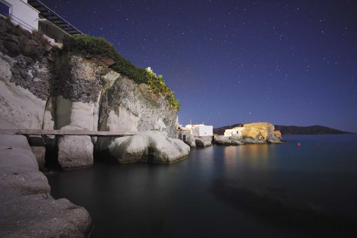 Κάτω από το γραφικότατο Χωριό βρίσκεται το ακόµη πιο γραφικό λιµανάκι Γούπα. Πάνω από τα περίτεχνα βράχια βρίσκονται χτισµένα, το ένα πάνω στο άλλο, τα κουκλίστικα κυκλαδίτικα σπιτάκια. Εδώ θα απαντήσεις τα περισσότερα «σύρµατα» ή «µαγαζιά», όπως αλλιώς µου είπαν ότι τα αποκαλούν. Τις πολύχρωµες πόρτες πάνω στα βράχια, όπως αυτές στην Ψάθη, που κεντρίζουν τη φαντασία σου κι αναρωτιέσαι τι κρύβεται πίσω από αυτές. Είναι υπόσκαφες κάµαρες φτιαγµένες για τις ψαρόβαρκες, δουλεµένες µε τον κασµά. ∆ηµιουργήθηκαν προφανώς γιατί τα πετρώµατα είναι αρκετά µαλακά. Επίσης από την ανάγκη για προστασία των σκαφών, καθώς η Κίµωλος δεν έχει λιµάνι ικανό να την προστατεύει από τους ανέµους, και κυρίως από τον Νοτιά. Οι ξύλινες ψαρόβαρκες στο µικρό λιµανάκι, όταν είναι ήρεµα τα νερά, θαρρείς πως αιωρούνται. Σε συνδυασµό µε τις πολύχρωµες πόρτες πάνω στα βράχια, σχεδόν στο ίδιο επίπεδο µε το νερό, δηµιουργούν µια ονειρική εικόνα, από αυτές που εντυπώνονται στη µνήµη σου και συνδέονται άρρηκτα µε το ξεχωριστό ελληνικό καλοκαίρι. Βράχο βράχο συνεχίζεις για να απολαύσεις τα βραχογλυπτά, παρέα µε φυσικές πισινούλες ως τον Καρρά. Εκεί θα συναντήσεις κι άλλα «σύρµατα» και άλλα µικροσκοπικά λιµανάκια µε σπιτάκια των ψαράδων. Τα αποκαλούν «σύρµατα» γιατί ανέβαζαν τις βάρκες µέσα µε συρµατόσχοινα. Ο Νικόλας Μαριανός, ένας ψαράς που συνάντησα στην περιδιάβασή µου, µου είπε ότι κανείς δεν ξέρει πότε ακριβώς χτίστηκαν, πάντως σίγουρα πάνε πολλές δεκαετίες. Θα µου πει για τη ζωή του ψαρά, που είναι δύσκολη πια, αλλά που δεν την αλλάζεις εύκολα γιατί είναι όµορφη συνάµα. Λίγοι ψαράδες έχουν αποµείνει πια. Τα σύρµατα που υπάρχουν είναι γύρω στα 50 αλλά δεν τα χρησιµοποιούν όλα. Οι πιο πολλές τράτες τώρα είναι προστατευµένες στο λιµανάκι του Αϊ-Μηνά. Εκτός από ψαράδες, οι λίγοι νέοι που έχουν µείνει στο νησί ασχολούνται είτε µε τον τουρισµό, είτε δουλεύουν στα µεταλλεία της Κιµώλου αλλά και της Μήλου, που είναι πολύ κοντά. Με µικρό φεριµπότ-παντόφλα περνάς στα Πολλώνια της Μήλου µόλις σε ένα 20λεπτο. Τον παρακολούθησα να περνά µε τη βάρκα του µέσα από τα βράχια του µικρού φυσικού λιµανιού και να ξανοίγεται, καθώς έπεφτε το φως, για την ψαριά της βραδιάς.