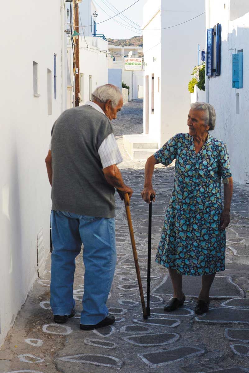 Αφού χόρτασες θάλασσα, κάποια στιγµή πρέπει να χορτάσεις και την πείνα σου! Εκτός από τις ταβέρνες στην Αλυκή, στην Μπονάτσα και στην Ψάθη, όλα τα υπόλοιπα εστιατόρια βρίσκονται στο Χωριό. Είναι και το µοναδικό του νησιού, γι’ αυτό το λένε Χωριό και όχι Χώρα. Ένας δαιδαλώδης καθαρόαιµος κυκλαδίτικος οικισµός, που σε πλανεύει όταν χάνεσαι µέσα στα ονειρικά σοκάκια του. Είναι πολύς ο καιρός που είχα να τριγυρίσω σ’ ένα κυκλαδίτικο χωριό και είχα ξεχάσει αυτή τη µοναδική αίσθηση γαλήνης και οµορφιάς που σε κάνει να αισθάνεσαι σαν να είσαι στο σπίτι σου… Οι άνθρωποι, φιλικοί και ευγενικοί, θα σε υποδεχτούν µε µεγάλη χαρά.