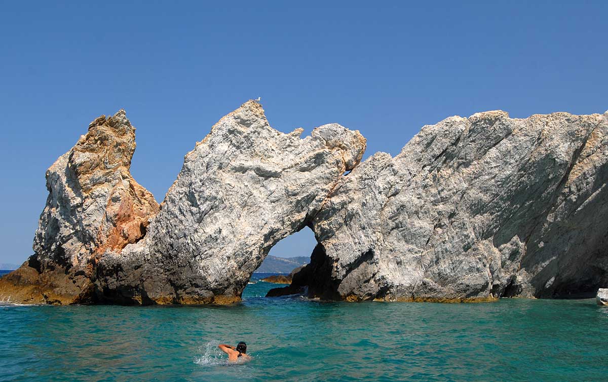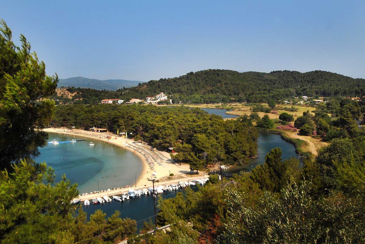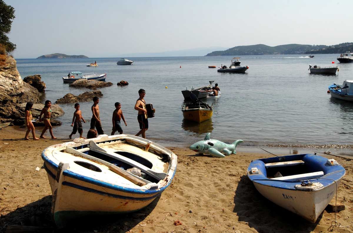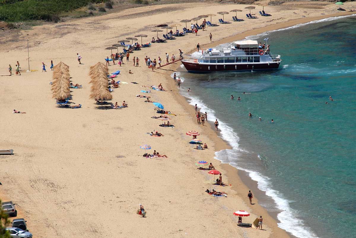 …γι’ αυτό και καταλήγουμε στα γαλήνια νερά της Μεγάλης Άμμου, της μεγαλύτερης παραλίας του νησιού με το πράσινο να κυριαρχεί, τόσο στην οργανωμένη πλευρά όσο και στην πιο ερημική. Η χρυσαφένια άμμος της Αχλαδιάς έχει άριστη τουριστική υποδομή, ενώ προστατευμένη μέσα σε όρμο είναι η Καναπίτσα με πρασινογάλανα νερά σε κατάφυτη τοποθεσία με δωμάτια και ξενοδοχεία, και η διπλανή Τζανέρια απ’ όπου ξεκινούν τις πλεύσεις τους τα καραβάκια. Πιο ρομαντική η Αγία Παρασκευή, ενώ στο κάμπινγκ μέσα στον εύφορο Ξάνεμο η παραλία βλέπει το ηλιοβασίλεμα. Το φλογερό κόκκινο μας μαγεύει πάνω στα νερά του Μεγάλου Γιαλού. Στο εξωτικό Μανδράκι με τους πελώριους αμμόλοφους φθάνουμε με καραβάκι, όπως και στα νησάκια Τσουγκριές, που προσφέρονται για απόλυτη νηνεμία στον ίσκιο πυκνής φυλλωσιάς. Με πλεούμενο, προτείνουμε τον όρμο του Νικοτσάρα όπου τα δέντρα φιλούν τη θάλασσα και καθρεφτίζονται μέσα της, τη μικρή ακτή Κεφάλα και τα Λαλάρια με τα ολόλευκα βότσαλα για να κολυμπήσουμε στα τιρκουάζ νερά ως τα απόκρημνα βράχια με τις σπηλιές.