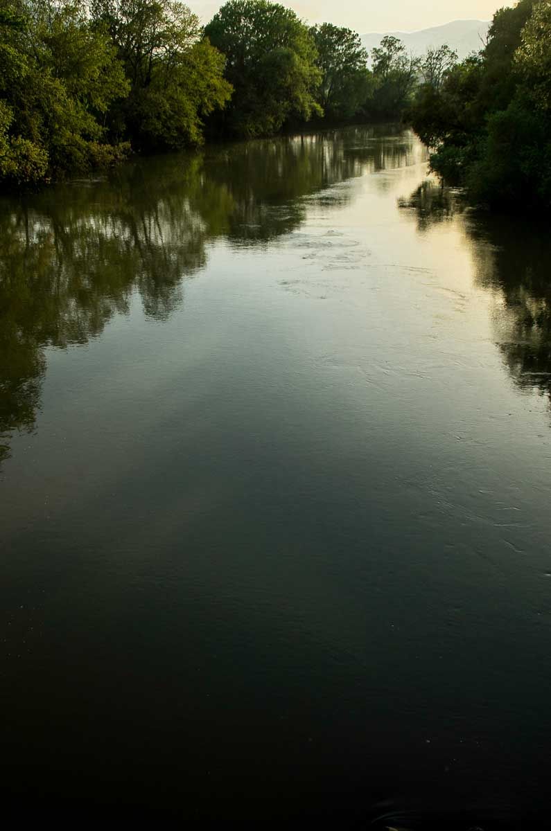 Στροφή με τη στροφή στη φιδίσια ανηφοριά, η θέα του Πηνειού, όπως φωτίζεται στον ήλιο του μεσημεριού, επιβεβαιώνει τον ομηρικό χαρακτηρισμό «αργυροδίνης» – αυτός που σχηματίζει ασημόχρωμες δίνες.