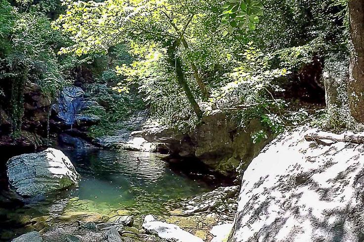 Ακολουθούμε το καλά συντηρημένο από τον Δήμο Αγιάς μονοπάτι, που φθάνει ως τη θάλασσα της Βελίκας. Κατηφορίζουμε περνώντας ξύλινα γεφύρια, βγάζουμε φωτογραφία στην κορνίζα που έχει σχηματίσει ο κορμός ενός δέντρου. Εντυπωσιαζόμαστε όταν συναντάμε έναν μεγάλο βράχο, που είναι η τελευταία κατοικία ενός μοναχού που ασκήτεψε στα μέρη. Ψηλαφίζουμε τη χρονολογία της