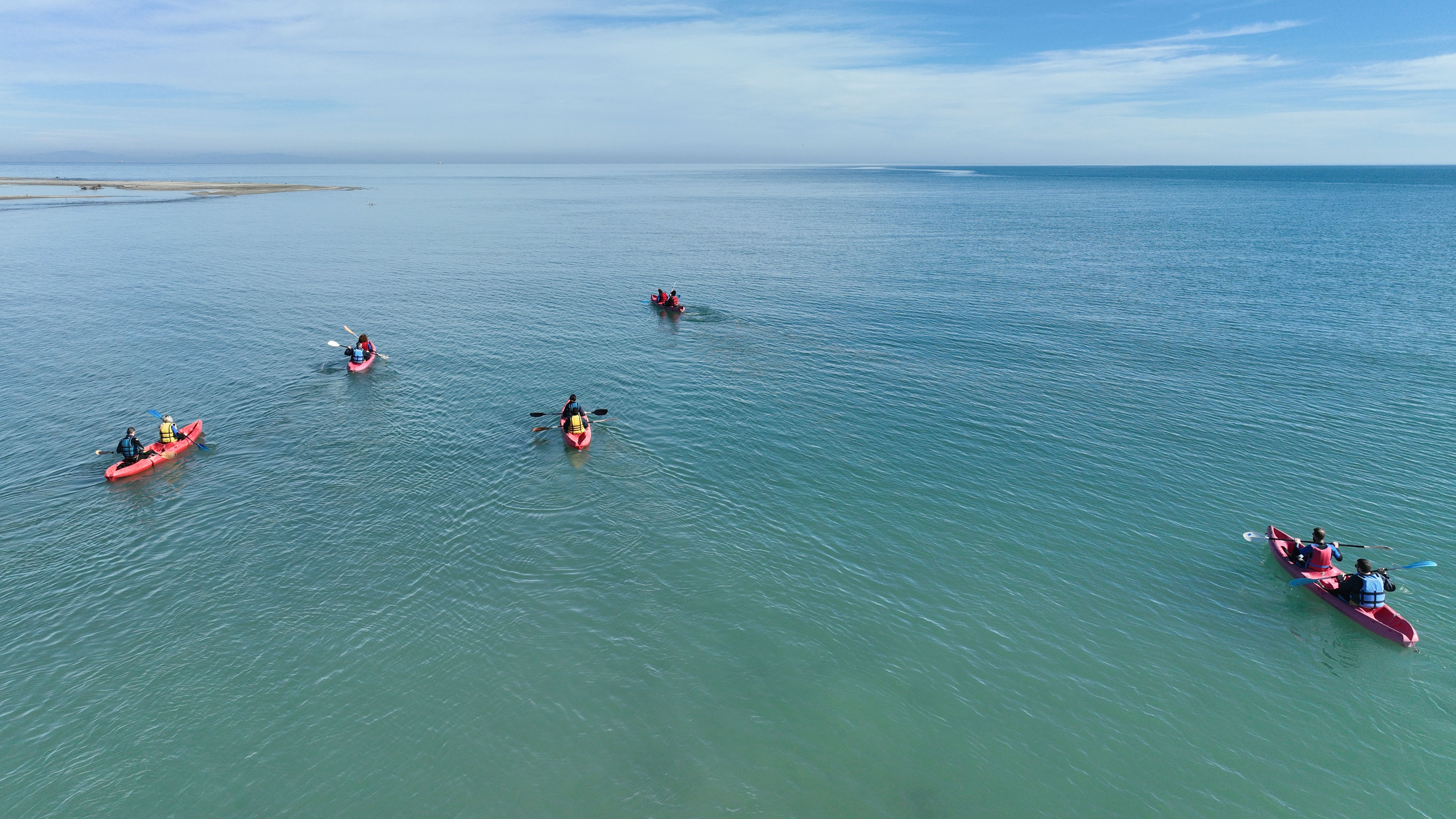Η δροσερή ανάσα του Πηνειού σμίγει με τα Αιγαιοπελαγίτικα νερά πάνω στην αμμώδη παραλία, τα κανό μας κινούνται σε χορευτική συμφωνία κι εμείς υποκλινόμαστε στη ροή του τραβώντας κουπί!
