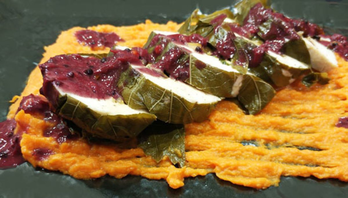 Μους γαλοπούλας σε αμπελόφυλλα με γέμιση και σάλτσα ροδιού