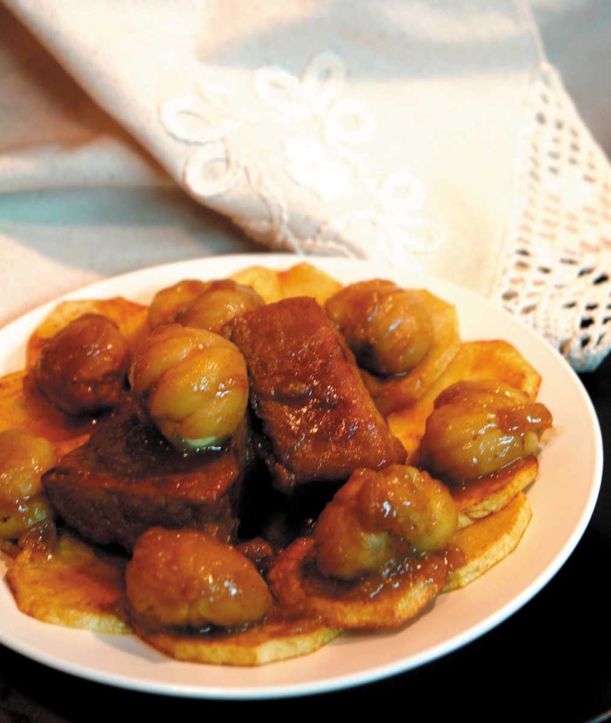 Βράζουμε τα κάστανα σε μια κατσαρόλα με νερό και λίγο αλάτι για 30’ περίπου. Τα καθαρίζουμε από την εξωτερική και την εσωτερική φλούδα με το χνούδι, με προσοχή ώστε να μη σπάσουν. Καθαρίζουμε και ψιλοκόβουμε τα κρεμμύδια. Σε αντικολλητικό τηγάνι ρίχνουμε το ελαιόλαδο και σοτάρουμε ελαφρά τα ψιλοκομμένα κρεμμύδια και το κρέας, γυρίζοντάς το απ’ όλες τις πλευρές. Μόλις μαλακώσει λίγο και ροδίσει ελαφρά, το σβήνουμε με το κόκκινο κρασί. Προσθέτουμε και τον χυμό πορτοκαλιού και αδειάζουμε το κρέας και τα κρεμμύδια σε βαθιά κατσαρόλα. Προσθέτουμε νερό, τα δύο φύλλα δάφνης, αλάτι και πιπέρι, και αφήνουμε το φαγητό να βράσει σε χαμηλή φωτιά με σκεπασμένη την κατσαρόλα. Μόλις το κρέας μαλακώσει και μείνει με λίγο ζουμί, ρίχνουμε στην κατσαρόλα τα βρασμένα κάστανα και αφήνουμε το φαγητό να μαγειρευτεί για ένα τέταρτο ακόμη, μέχρι να δέσει η σάλτσα του. Προσοχή στο ανακάτεμα, όταν ρίξουμε τα κάστανα στην κατσαρόλα (για να μη διαλυθούν). Συνοδεύουμε το φαγητό μας με φρεσκοτηγανισμένες πατάτες σε ροδέλες ή σπυρωτό ρύζι πιλάφι και σερβίρουμε αμέσως.
